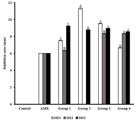 Table 3 presents the means and standard deviations of three replicates of IZE against the multidrug-resistant E. coli strains. When analyzing the antimicrobial effect of the extracts by group, the results exhibited differential behaviors between years (Figure 3). 2021 and 2023 results exhibited higher inhibition values in G2 and G3 samples. In 2023, for G1 and G4, the IZE values were higher compared to the other samples. Interestingly, 2022 results were lower than the other years in all groups.