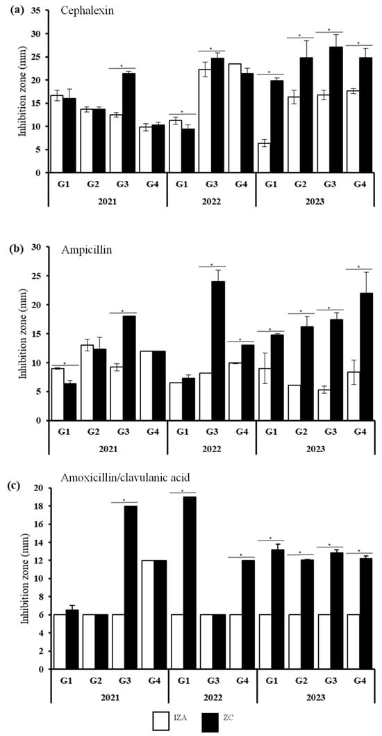 Synergic effect of the combination of the M. oleifera extract with (a) cephalexin, (b) ampicillin, and (c) amoxicillin/clavulanic acid against the resistant E. coli strains isolated from the food samples. Statistically significant differences between IZA and IZC are indicated as * p < 0.05.