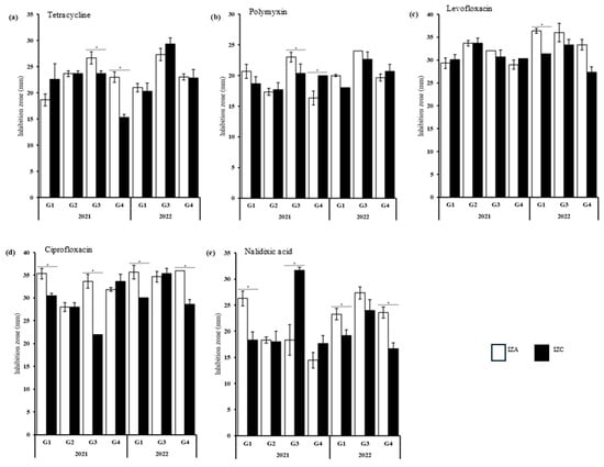 Antagonist effect of the combination of the M. oleifera extract with (a) tetracycline, (b) polymyxin, (c) levofloxacin, (d) ciprofloxacin, and (e) nalidixic acid against the resistant E. coli strains isolated from the food samples. Statistically significant differences between IZA and IZC are indicated as * p < 0.05.