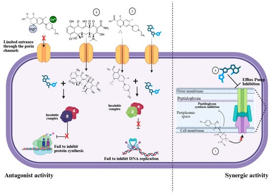 Model of the possible molecular mechanisms of beta-lactams (amoxicillin) (1), quinolone (ciprofloxacin) (2), and tetracycline (3) antibiotics affected by treatment with the extract of M. oleifera (4). The methanolic extract drags chemical species that might have a bactericidal effect, enhancing the activity of beta-lactams by disrupting the activity of flow pumps such as the RND protein. Moreover, the molecules contained in the extract might form insoluble complexes with quinolones and tetracycline, significantly attenuating their antimicrobial activity. Furthermore, the calcium and magnesium of the seed could form complexes with the antibiotic limiting their entrance through the porin channels.
