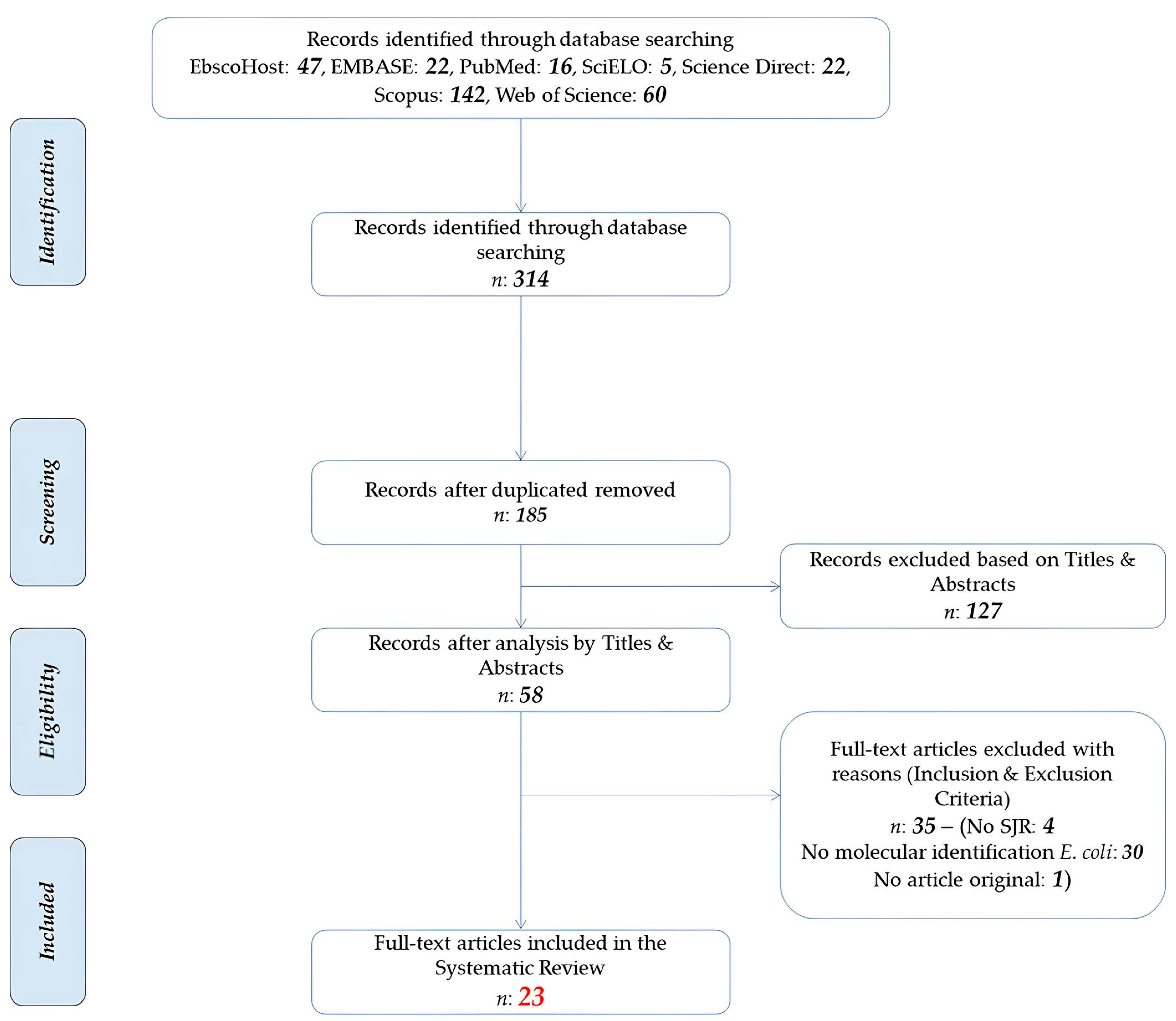 | Sauces Ceviche Salad Cheese 150 | 1 | Brilliant green bile broth ESBL CHROM Agar | Boiling | Quadruplex PCR | A—B1—B2—D | arpA | 400 | Zurita et al., 2020 [85] |