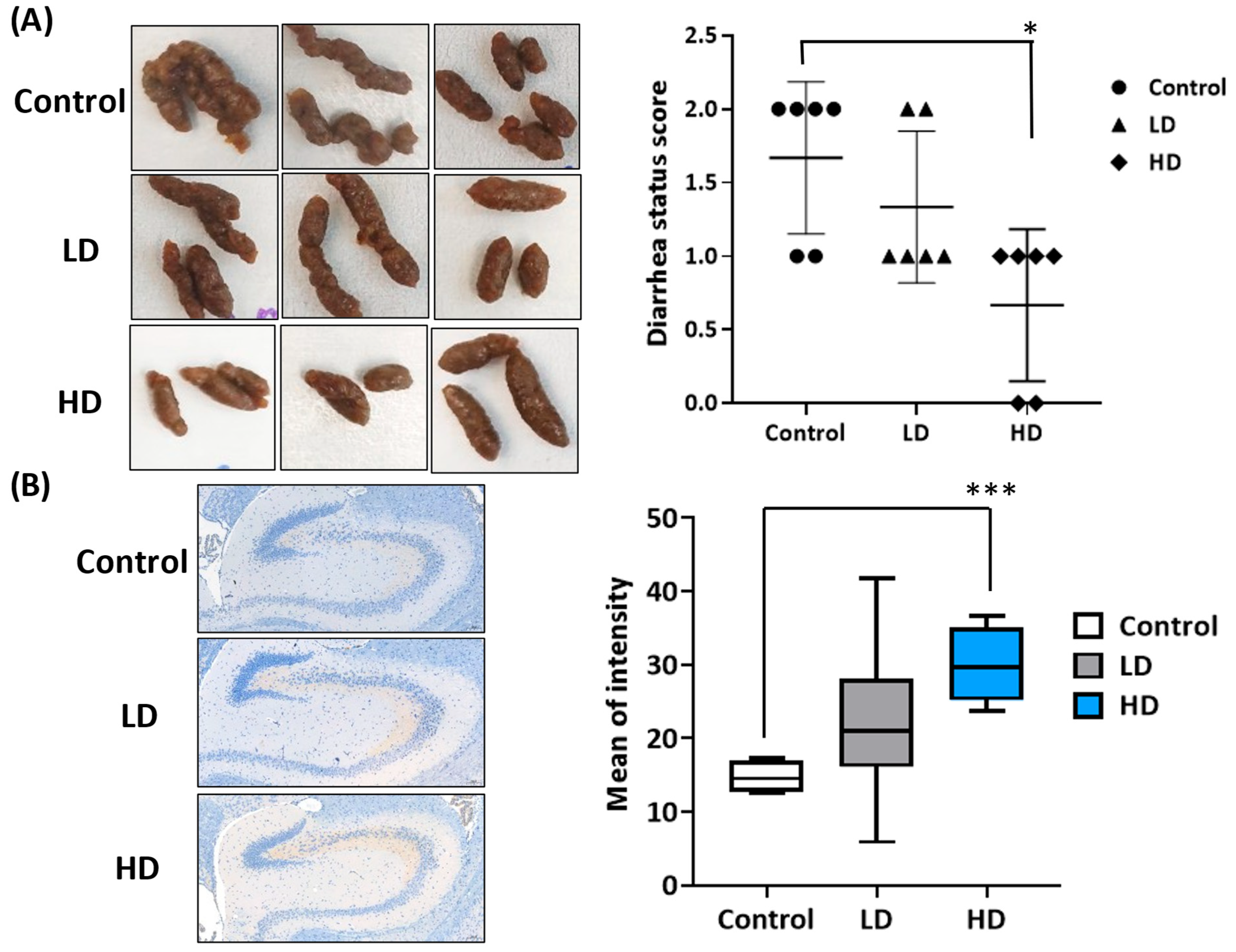 - Thabet, E.; Dief, A.E.; Arafa, S.A.F.; Yakout, D.; Ali, M.A. Antibiotic-Induced Gut Microbe Dysbiosis Alters Neurobehavior in Mice through Modulation of BDNF and Gut Integrity. Physiol. Behav. 2024, 283, 114621. [Google Scholar] [CrossRef] [PubMed]