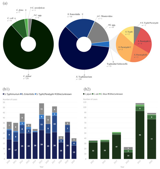 Matos MI, Rocha R, Pinto J, Guimarães A, Lino R, Rocha MH, Patacho M, Duro R, Santos L, Almeida J. Zoonotic Foodborne Infections in a Tertiary Healthcare Setting: Clinical and Epidemiological Aspects of Campylobacter and Salmonella Infection in Northern Portugal in 2010–2020. Microbiology Research. 2025; 16(2):29. https://doi.org/10.3390/microbiolres16020029