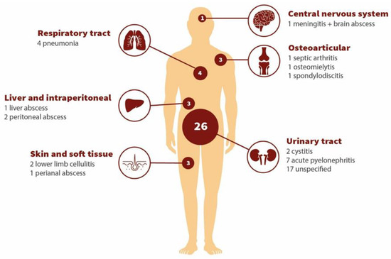 - Peña-Sagredo, J.L.; Fariñas, M.C.; Perez-Zafrilla, B.; Cruz-Valenciano, A.; Crespo, M.; Joven-Ibañez, B.; Riera, E.; Manero-Ruiz, F.J.; Chalmeta, I.; Hernández, M.V.; et al. Non-typhi Salmonella infection in patients with rheumatic diseases on TNF-alpha antagonist therapy. Clin. Exp. Rheumatol. 2009, 27, 920–925. [Google Scholar] [PubMed]