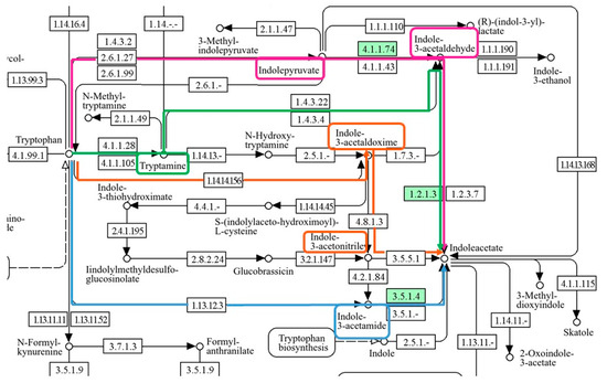 As a rule, IAA is synthesized in two ways: Trp-dependent and Trp-independent. However, the Trp-independent way has not yet been identified in bacteria. The four main Trp-dependent ways of IAA synthesis in bacteria are described in the publication by Zhang et al. [50]. We highlighted the KEGG tryptophan metabolic way with arrows of different colors for the ease of perception of information about the presence of the necessary genes in the bacterium (Figure 2). The first way (crimson) is through indole-3-pyruvate, the second (green) is through tryptamine, the third (orange) is through indole-3-acetonitrile, and the fourth is through indole-3-acetamide. A bacterium may have several synthesis ways, but the issue of regulation and functional redundancy is still open [52].