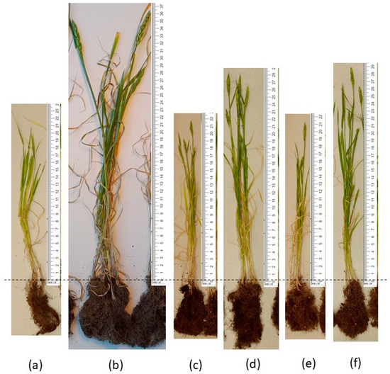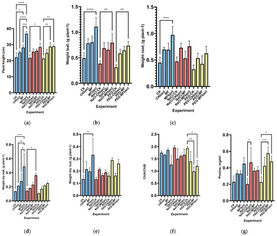 The plant growth lasted for 30 days. During the growing period, the average temperature was 22 °C, and the relative humidity fluctuated was 70–80%. Agronomic parameters such as plant height (cm), root and aboveground biomass (g), dried root, and aboveground biomass (g) were measured after 30 days. The content of chlorophyll a and b, carotenoids were determined as described in [26] (extraction method in 95% ethanol), and the proline content was determined as described in [27] (Colorimetric Assay).