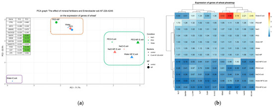 Comparing the groups for statistical differences in the data, the significance was tested using ordinary one-way ANOVA analysis and Tukey’s multiple comparisons test by GraphPad Prism 10 (https://www.graphpad.com/features, accessed on 12 August 2024). A principal component analysis (PCA) was performed to analyze the relationships between soil isolates and parameters measured by tests. PCA was performed using the R procomp function with standard parameters (https://www.rdocumentation.org/packages/stats/versions/3.6.2/topics/prcomp, accessed on 12 May 2023). The results are presented on a two-dimensional graph, the axes of which are the first two main components: PC1 and PC2. The interpretation of the graph is based on the clustering of samples into groups. To visualize the numerical change in the level of gene expression, a clustered heat map was built using pheatmap v. 1.0.12 function in R package [25].