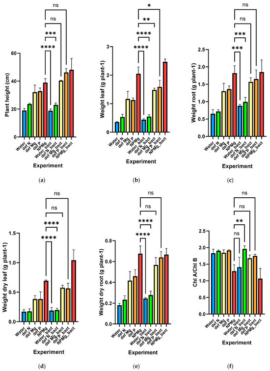 The purpose of the first experiment was to evaluate the growth qualities of wheat when watering with bacterial suspension in two different ways: application on a leaf and watering under the root. Bacterial suspension treatment was carried out one time per week, a total of four times per experiment. Additionally, in this experiment, the ability of the E. soli strain AF-22b-4245 to increase the efficiency of mineral fertilizers was evaluated. Watering of plants with water or a solution of mineral fertilizers was carried out daily. The results of the experiment are summarized in Table 4 and Figure 3.
