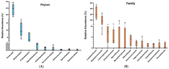 The composition of the microbiota at different taxonomic levels: phylum (A) and family (B).