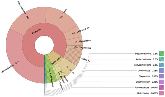 The microbiota of snake eels was predominantly composed of bacteria belonging to the phylum Firmicutes, accounting for more than 84.03% of the relative abundance (Figure 1). Other notable phyla included Bacteroidota and Proteobacteria, with relative abundances of 10.43% and 4.30%, respectively. Minor components comprised Desulfobacterota, Actinobacteriota, and Verrucomicrobiota, with relative abundances of 0.60%, 0.29%, and 0.19%, respectively. At the family level, the most abundant taxa were Lactobacillaceae, representing 32.83% of the relative abundance, followed by Staphylococcaceae with 18.93%. Other less abundant taxa included Lachnospiraceae, Enterococcaceae, Marinifilaceae, Mycoplasmataceae, and Rikenellaceae, with relative abundances of 7.16%, 5.04%, 3.89%, 3.70%, and 3.57%, respectively. At the genus level, Latilactobacillus was the predominant genus, comprising 31.98% of the total abundance. Following Latilactobacillus, Staphylococcus accounted for 18.92%. Minor genera included Enterococcus, Mycoplasma, Vagococcus, Rikenella, Alistipes, and Pseudomonas, with relative abundances of 5.04%, 3.70%, 1.62%, 1.37%, 1.35%, and 1.10%, respectively (Figure 2).