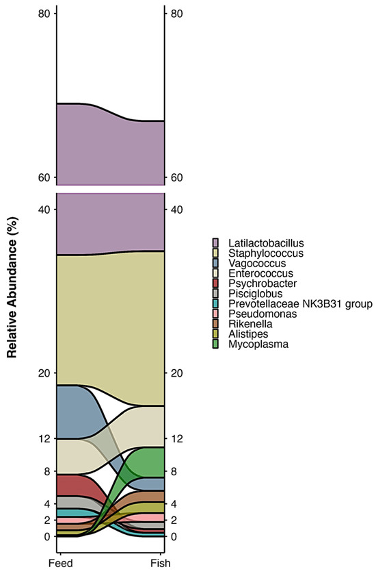 We conducted an analysis of bacterial communities in feed, as diet is known to influence gut microbiota composition. From the feed samples, a total of 201,694 reads were obtained, averaging 50,410 reads per sample. The predominant bacterial phylum detected in the feed was Firmicutes, comprising more than 81.72% of the total reads. Additional phyla included Proteobacteria and Bacteroidota, accounting for 8.58% and 7.95% relative abundance, respectively. At the family level, Lactobacillaceae was the most abundant, representing 36.71% of the total relative abundance, followed by Staphylococcaceae with 15.98%. Minor components included Vagococcaceae, Enterococcaceae, Moraxellaceae, Lachnospiraceae, Prevotellaceae, Muribaculaceae, Rikenellaceae, and Carnobacteriaceae, with relative abundances of 6.52%, 4.37%, 3.73%, 3.19%, 2.39%, 2.11%, 2.00%, and 1.92%, respectively. At the genus level, Latilactobacillus dominated the composition, representing 34.96% of the relative abundance. Staphylococcus followed with 15.93%. Minor genera included Vagococcus, Enterococcus, Psychrobacter, Pisciglobus, and the Prevotellaceae NK3B31 group, accounting for 6.52%, 4.37%, 2.63%, 1.53%, and 1.02%, respectively. Figure 3 shows the variations in some genera between feed and gut microbiota; however, they do not show significant differences (Supplementary Materials).