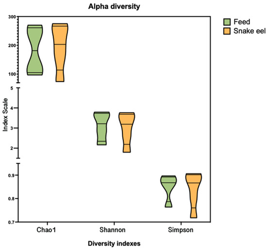 The Chao, Shannon and Simpson alpha diversity indexes contrasting feed and gut microbiota.