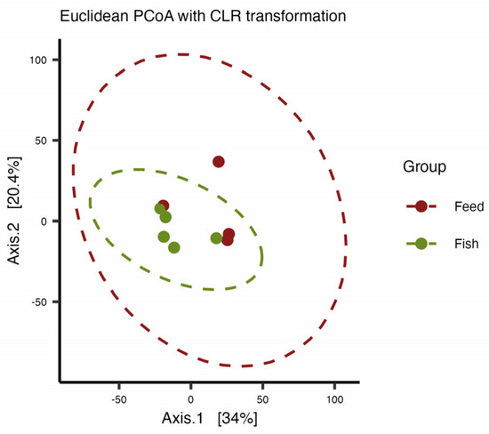 Differences in microbial composition between samples or groups (feed versus gut microbiota) were visualized using PCoA, a powerful tool in beta diversity analysis (Figure 5). The result of PERMANOVA analysis, based on Aitchison distance, revealed no significant differences between the groups (R2 = 0.180, p value = 0.116).