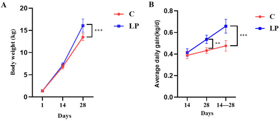 The results of the suckling piglet’s weight changes are shown in Figure 1A. The differences between the two groups on day 1 and day 14 were not significant. Compared with those in the C group, the suckling piglets in the LP group had significantly higher body weights on day 28. The results of the average daily weight gain of the suckling piglets are shown in Figure 1B. Compared with the C group, the suckling piglets in the LP group showed no significant difference on day 14, while they were significantly higher on day 28 and between day 14 and 28. The results indicated that supplementation with LPJZ-658 significantly improved the growth performance of the suckling piglets.