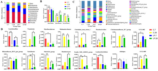 The microbial composition of the intestinal contents of the suckling piglets was analyzed, and the 10 most abundant phyla are shown in Figure 3A. At day 7, Firmicutes, Bacteroidetes, and Proteobacteria were the dominant phyla in the C and LP groups, accounting for more than 90% of the total bacterial abundance. As the suckling piglets grow, the dominant phyla change to Firmicutes, Bacteroidetes, and Spirochaetota by day 28. As shown in Figure 3B, the relative abundance of Spirochaetota and Euryarchaeota was significantly higher in both the C group and LP group at day 28 compared to day 7. It is noteworthy that the relative abundance of Bacteroidota was significantly lower on day 28 compared to day 7 in the C group, but did not change significantly in the LP group.