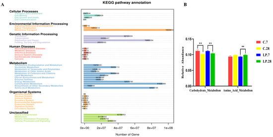 As shown in Figure 5A, the KEGG annotation results showed that 764019964 genes were enriched in 41 metabolic pathways. Among them, membrane transport, carbohydrate metabolism, and amino acid metabolism were the three most important metabolic pathways. In addition, carbohydrate metabolism was significantly reduced in both the C group and the LP group on day 28 compared to day 7. Importantly, amino acid metabolism was significantly increased in the LP group at 28 days compared to that at 7 days, whereas no change was found in the C group (Figure 5B).