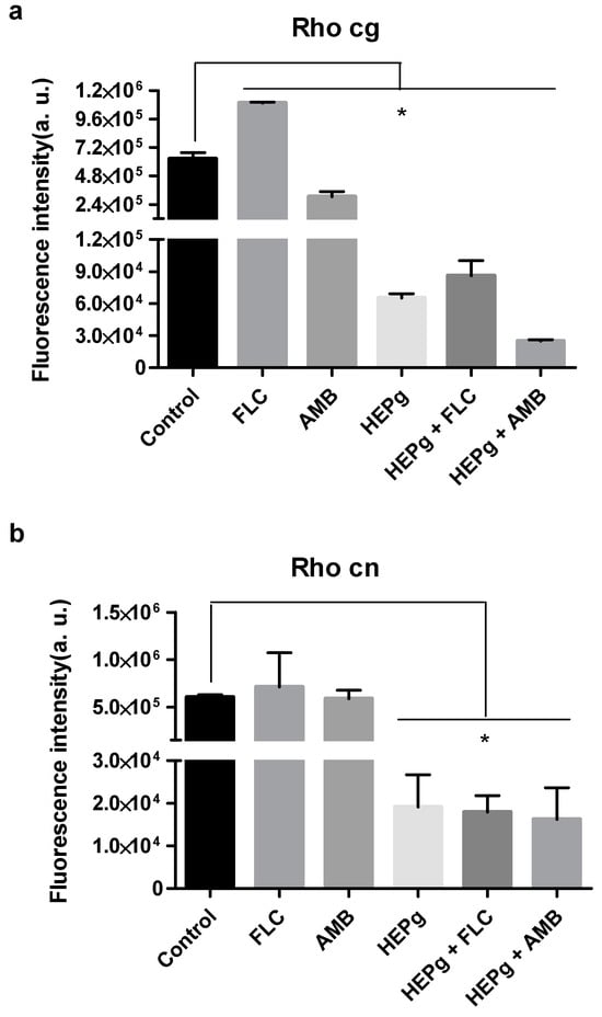 Figure 1. Determination of mitochondrial membrane potential (ΔΨm) in isolates C. gattii 196L (a) and C. neoformans 62066 (b), respectively, using the Rhodamine 123 probe. Arbitrary units of fluorescence (AU). An asterisk represents statistical differences between the treatments and the control * (p < 0.05). The tests were performed in duplicate. Control, fungus + RPMI; FLC, fluconazole + fungus + RPMI; AMB, amphotericin B + Fungus + RPMI; HEPg, extract + fungus + RPMI; HEPg +FLC, extract + fluconazole + fungus + RPMI; HEPg+AMB, extract + amphotericin B + fungus + RPMI. *: (p < 0.05).