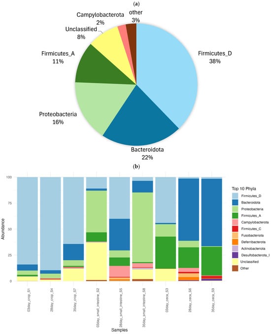 In addition to age-related changes, microbial composition varied between gut regions (crop, small intestine, and ceca). The ceca exhibited a major microbiome shift, transitioning from Firmicutes_D dominance (27.30%) at early stages to Bacteroidota predominance (53.99% on day 28, 44.06% on day 35), reflecting microbiome maturation. The small intestine initially had a high presence of Proteobacteria (36.08%), which declined significantly by day 28 but showed a minor resurgence on day 35. The crop remained largely dominated by Firmicutes_D, though its abundance gradually declined from 73.68% at early stages to 32.25% by day 35, with a slight increase in Bacteroidota and Proteobacteria in later stages.