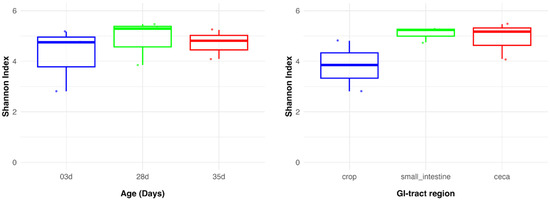 Alpha and beta diversity measurements based on age and GI-tract regions. Shannon index, Simpson index, and Bray–Curtis dissimilarities for age and GI-tract regions. With age, microbial diversity and their evenness increase in all three GI-tract regions studied (crop, small intestine, and ceca).