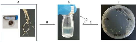 Isolation process from environmental samples. (A) Soil, compost, roots, and mulch were harvested from the local environment. (B) Each sample was inoculated into a semi-solid nitrogen-free medium. (C) Each McCartney bottle was filled to 50% with a nitrogen-free semi-solid medium and inoculated with 10 µL of sample. A pellicle of growth can be observed on the surface of the medium. (D) In total, 10 µL of the pellicle was inoculated into a new bottle containing the same nitrogen-free medium and, subsequently, (E) a loopful of the new pellicle was plated onto the same nitrogen-free medium as C but with agar (15–25 g/L). (F) Nitrogen-free solid medium plate showing the growth of single colonies.