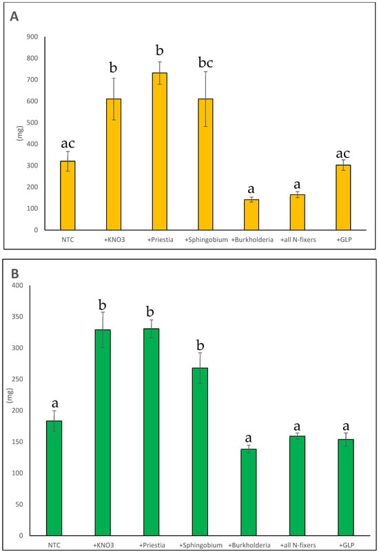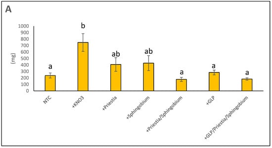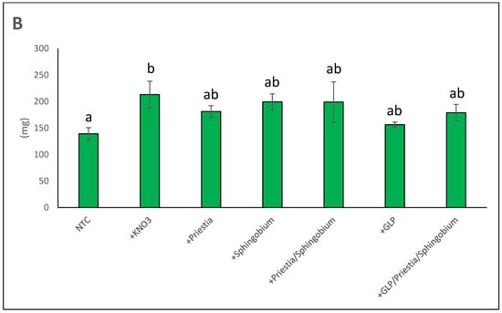 The results obtained for the shoot systems are shown in Figure 4B. The shoot fresh weights of the KNO3 group (213.2 ± 25.2 mg) were the only ones that were significantly greater than those of the NTC group (139.1 ± 11.7 mg). The shoot fresh weights of plants treated with P. megaterium (169.5 ± 15.9 mg), S. yanoikuyae (199.5 ± 15.0 mg), a combination of P. megaterium and S. yanoikuyae (179 ± 35.5 mg), Great Land Plus® (135.5 ± 13.9 mg), and a combination of P. megaterium, S. yanoikuyae, and Great Land Plus® (178.8 ± 15.9 mg) were not significantly different to those of either the NTC or KNO3 groups.