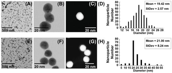 TEM images and size distribution histogram of AuNPs and ASO-AuNPs. (A–C) TEM micrographs of gold nanoparticles (AuNPs) synthesized by sodium citrate reduction, highlighting their spherical shape. (D) A corresponding size distribution histogram, revealing a principal diameter peak near 19.42 nm. (E–G) TEM micrographs of antisense oligonucleotide-functionalized AuNPs (ASO-AuNPs). A faint “halo” around the nanoparticle periphery is indicative of ASO adsorption. (H) A size distribution histogram of ASO-AuNPs, which still centers near ~21.00 nm despite an extended tail.