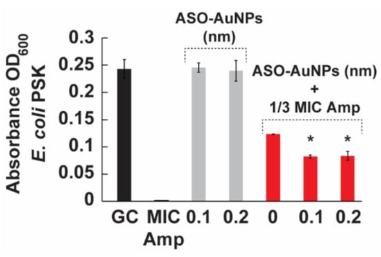 The effect of ASO-AuNPs on the growth of the PSK strain. Bacteria was cultured in LB broth for 24 h at 37 °C. Growth of the strain was monitored at OD600. The cells were treated with the MIC of ampicillin (32,768 ppm), 1/3 MIC of ampicillin, ASO-AuNPs (0.1 and 0.2 nM), and the combination of ASO-AuNPs at either 0.1 or 0.2 nM and 1/3 MIC ampicillin. Data are shown as the mean ± standard deviation of three samples. (*) indicates values significantly different (p < 0.05) from the corresponding control, as determined by one-way ANOVA followed by Tukey’s post-hoc test. Amp: ampicillin, and ASO: antisense oligonucleotides.