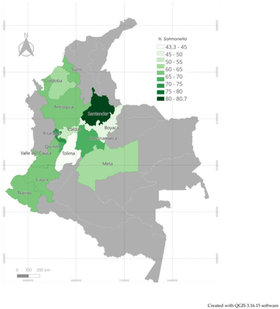 Salmonella positivity by ELISA per Colombian department (state) (2022–2023): Salmonella positivity varied across Colombian departments. Santander recorded the highest positivity rate at 80.67%, followed by Risaralda at 72.67%. In contrast, Tolima and Boyacá had the lowest rates of 43.33% and 46.48%, respectively.
