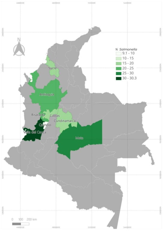 A total of 848 different samples (feces, tissues, etc.) were examined, out of which Salmonella was isolated in 199 of them, representing a positive rate of 23.47%. In this context, the departments (states) of Antioquia, Valle del Cauca, and Cundinamarca stood out for the quantity of samples submitted for analysis using this method. The departments where the agent was least isolated were Atlántico, Córdoba, and Tolima with 0 isolations, as shown in Table 2 and Figure 2.