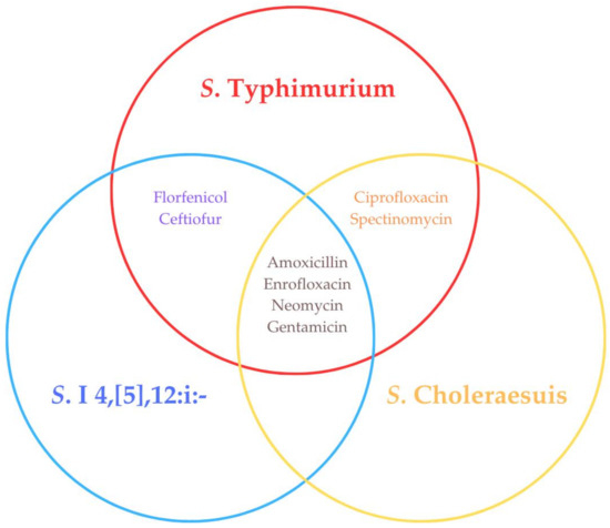 Salmonellosis in animals and humans is typically characterized by a self-limiting gastroenteritis syndrome; however, more severe invasive Salmonella infections, such as bacteremia and/or other extraintestinal infections, can occur [8]; antimicrobial use is indicated for treatment in such cases. In pigs, these may include amoxicillin-clavulanic acid, ampicillin, ceftiofur, ciprofloxacin, chloramphenicol, florfenicol, gentamicin, sulfamethoxazole-trimethoprim, tetracycline, and macrolide antibiotics such as tilmicosin [9]; many of these are crucial for human therapy [10,11]. Food can serve as a vehicle for antibiotic-resistant bacteria, which is why it has such a significant impact on public health [12]. Improper antibiotic use can contribute to the generation of resistance that can be transferred to other pathogenic bacteria in both animals and humans [13]. Therefore, information on and the monitoring and control of antibiotic use are of paramount importance.