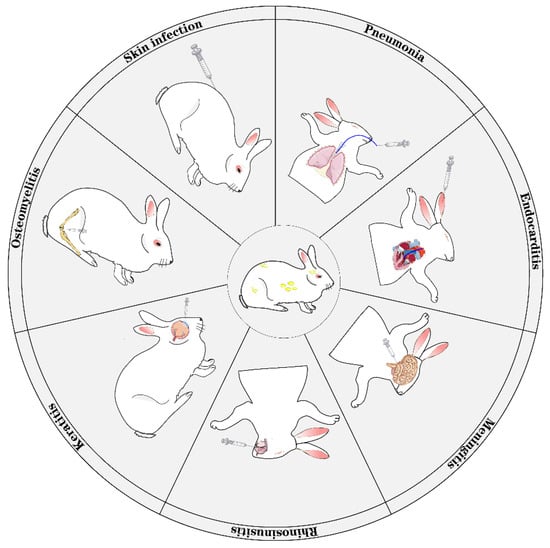 There are seven rabbit models of infectious diseases induced by S. aureus, including pneumonia, skin and soft tissue infections, osteomyelitis, keratitis, rhinosinusitis, meningitis, and endocarditis.