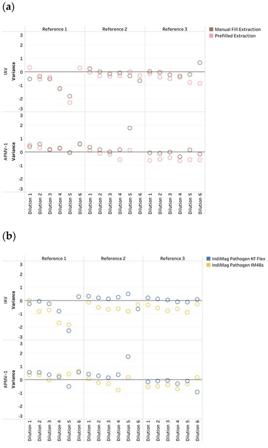 The influenza A virus (IAV) and avian paramyxovirus type-1 (APMV-1) CT variation across dilution levels of references. (a) Comparison of the manual and prefilled IndiMag Pathogen Kits versus the MagMAX Viral RNA Kit (MagMAX Viral); (b) comparison of the IndiMag Pathogen Kit using the KingFisher (KF) Flex and IndiMag 48s (IM48s) versus the MagMAX Viral on the KF Flex.