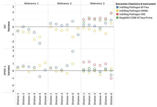For the IAV and APMV-1 extraction evaluation, each of the serial diluted reference strains and samples were extracted using the MagMAX Viral on the KF Flex according to the approved protocol [11], which was considered the gold standard for the performance comparison of extraction chemistry and equipment. The six serially diluted reference strains and samples were each extracted on the KF Flex and IM48s using manual and/or prefilled versions of the IndiMag Pathogen Kits to evaluate the reagents and IM48s equipment performance. Subsequently, the test samples and a single IAV and APMV-1 reference strain were extracted with the IndiMag Pathogen Kit on the IM2 and the MagMAX CORE on the KF Duo Prime to evaluate the equipment performance. The manufacturer’s instructions for the MagMAX Viral, MagMAX CORE, and IndiMag Pathogen Kits were followed, except for a single modification. The MagMAX Viral has a recommended 50 µL sample input, while the MagMAX CORE and IndiMag Pathogen Kits have a recommended 200 µL input sample volume. Thus, a mixture of a 50 µL sample input with 150 µL of phosphate-buffered saline (PBS) was used as starting material for the MagMAX CORE and IndiMag Pathogen Kits for an equivalent input sample volume between the extraction kits.