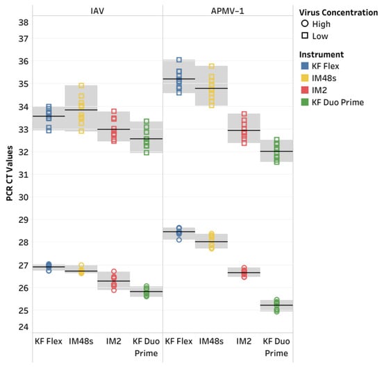 The precision was evaluated using the IndiMag Pathogen Kit on the KF Flex, IM48s, and IM2, as well as using the MagMAX CORE on the KF Duo Prime. Five replicates at high and low concentrations for both IAV and APMV-1 were run on different days, totaling 10 replicates at high and low concentrations for IAV and APMV-1 for each instrument (Figure 3, Supplemental Data Table S3). The average CT values for the high and low concentrations of IAV were 26.42 and 33.22, respectively. The average inter-run standard deviations for the high and low concentrations of IAV were 0.16 and 0.45, respectively. The coefficient of variation (CV) ranged between 0.16% and 1.76% for IAV. The average CT values for the high and low concentrations of APMV-1 were 27.08 and 33.72, respectively. The average inter-run standard deviations for the high and low concentrations of APMV-1 were 0.18 and 0.42, respectively. The CV ranged between 0.50% and 1.52% for APMV-1.