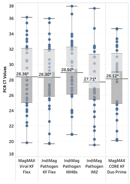A total of 32 positive and 30 negative samples were tested to evaluate the diagnostic sensitivity and specificity of the IndiMag Pathogen Kit on the KF Flex, IM48s, and IM2, as well as the MagMAX CORE on the KF Duo Prime, compared to the MagMAX Viral on the KF Flex (Figure 4, Supplemental Data in Table S4). The kappa coefficient was k = 1.0, indicating 100% agreement for both the diagnostic sensitivity and specificity of the extraction chemistry on its respective instrumentation. The average CT value was slightly lower, with a positive skew using the IndiMag Pathogen Kit on the IM2. However, a significant difference was lacking between the average CT values, regardless of the extraction chemistry and instrumentation (ANOVA test, p = 0.8602).
