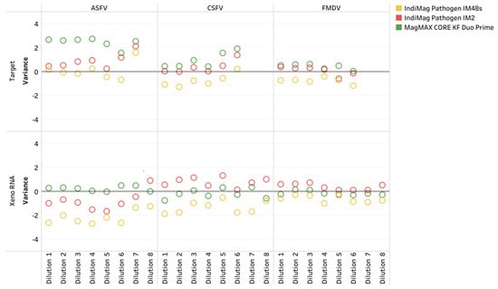 The African swine fever virus (ASFV), classical swine fever virus (CSFV), and foot-and-mouth disease virus (FMDV), and the Xeno Internal Positive Control RNA (Xeno RNA) CT variations across dilution levels for the IndiMag Pathogen Kit using the IndiMag 48s (IM48s) and IndiMag 2 (IM2), and the MagMAX CORE Nucleic Acid Purification Kit (MagMAX CORE) using the KingFisher (KF) Duo Prime versus the MagMAX CORE using the KF Flex.
