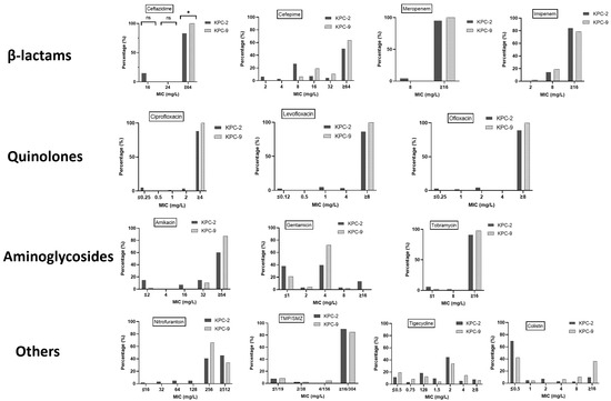 Minimum inhibitory concentration (MIC) distributions and cumulative percentage of KPC-2 and KPC-9 isolates inhibited by medically important antimicrobial agents (TMP/SMZ = trimethoprim/sulfamethoxazole). Significance in the diagrams is indicated using asterisks (ns = non-significant, * = p < 0.05).