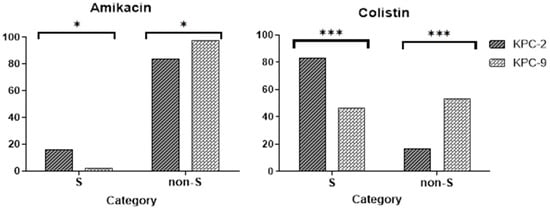 Histograms showing the statistically significant differences (chi-square test) in the percentage of KPC strains being either susceptible (S) or non-susceptible (non-S) to amikacin and colistin. Significance in the diagrams is indicated using asterisks (* = p < 0.05; *** = p < 0.001).