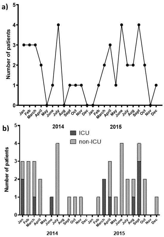 An outbreak of KPC-9-KP, as part of an ongoing KPC-2 outbreak in our hospital, was recorded. During the study period (2014–2015), 47 K. pneumoniae isolates harboring the KPC-9 carbapenemase were obtained from 41 patients. The time course of the isolation of KPC-9 strains and the distribution of patients between ICUs and non-ICU wards are shown in Figure 4a,b, respectively.