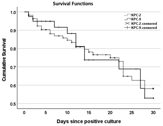 The total all-cause mortality among patients with an isolation of KPC-KP was 39.6%, escalating to 61.5% in the case of bloodstream infection. The mean time to death was approximately 25 ± 3 days, whereas 18% of patients died within 14 days of KPC strain isolation. Interestingly, 78% of the patients who died had been transferred to the ICU during their hospitalization. Figure 5 illustrates the 30-day cumulative survival of patients carrying KPC-2 versus those carrying the KPC-9 strain. No significant difference was found between the 30-day cumulative survival functions of KPC-2 vs. KPC-9 carriers (x2 = 0.023, p = 0.880).