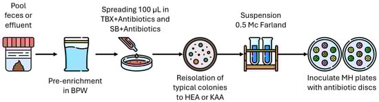 Procedures were carried out to isolate and identify E. coli and Enterococcus spp. Culturomics were used to study the phenotype of bacteria. For the detection of E. coli, 100 μL of the initial suspension was aseptically inoculated on Tryptone Bile X-glucuronide (TBX, Biokar Diagnostics) plates with and without antibiotics, namely ampicillin (AMP-8 μg/mL), ciprofloxacin (CIP-4 μg/mL), cefotaxime (CTX-2 μg/mL), colistin (COL-3,5 μg/mL) and imipenem (IPM-1 μg/mL). For Enterococcus spp., 100 μL of the initial suspension was aseptically inoculated on Slanetz and Bartley (SB, Biokar Diagnostics) plates with and without antibiotics, AMP-8 μg/mL, CIP-4 μg/mL, vancomycin (VAN)-8 μg/mL). Plates were incubated at 37 °C for 24 h for TBX plates and at 37 °C for 48 h for SB plates. Tested antibiotics were selected based on their significance in medicine and public health, according to Clinical and Laboratory Standards Institute (CLSI) guidelines [16]. A confirmation step consisted in a culture of isolates from TBX on Hektoen enteric agar (HEA, Biokar Diagnostics) and those from SB on Kanamycin aesculin Azide (KAA, Biokar Diagnostics), both incubated for 24 h at 37 °C (Figure 1).