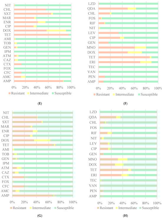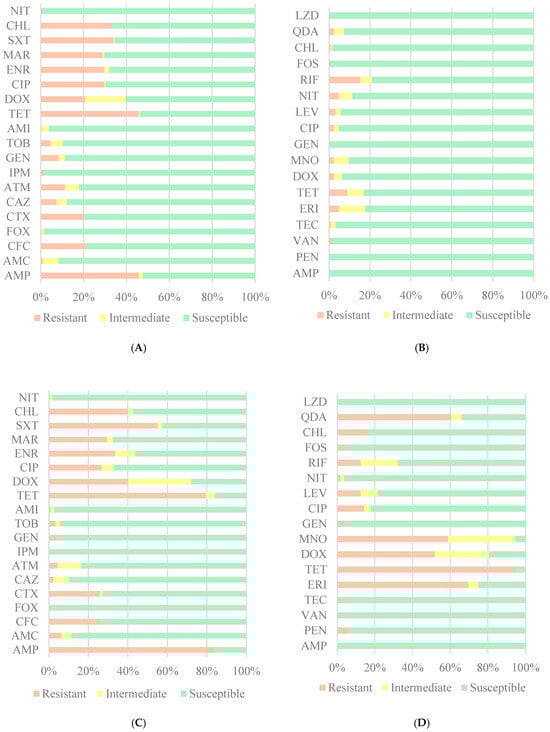 Data were registered in Microsoft Excel 365, and statistical analysis was performed in IBM SPSS Statistics 29 using Fisher’s exact test to compare the frequencies of resistance obtained for each antibiotic with the expected frequencies, considering α = 0.05. The resistance profiles of isolates along with the results of statistical tests can be found in the Supplementary Materials.