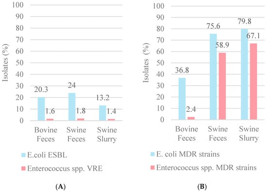 The highest percentage of ESBL-producing E. coli and VRE isolates was found in pig feces. It has been demonstrated that isolates from swine feces generally present more resistance to antimicrobials when compared to bovine feces. This can be attributed to the fact that pig production is more intensive than cattle production, and additionally, that their intestinal microbiome is more directly exposed than ruminal microbiota, which has a greater buffer effect [21,22]. A study in cattle has found that the diversity of rectal microbiota had a fastest and greatest decreased in diversity than the ruminal microbiota when exposed to antibiotics [23], suggesting larger susceptibility of the intestinal microbiota. On the other hand, the conditions of pig farms may be prone to antimicrobial challenges leading to the use of a greater quantity of oral antimicrobials [24]. According to the European Veterinary Antibiotic Sales Report, pigs represent a bigger animal mass than cattle (366 vs. 216 PUC, in 1000 tonnes) in Portugal in 2022 [25], which could lead to a higher use of antimicrobials by pig production. Antimicrobial resistance profiles also depend on the animal species and its specific microbiota, husbandry practices including hygiene and diet, as well as the historical presence of antibiotic resistance genes [26]. For instance, swine feed may be cross contaminated with antibiotics, causing a selective pressure in favor of the development of resistant strains [27]. Indeed, the development of bacterial resistance in livestock farms depends on the presence of selective pressures, either by antibiotics and other substances (e.g., heavy metals, biocides), or from reservoirs of resistance genes (e.g., wastewater), which may facilitate horizontal gene transfer [28]. The development of antimicrobial resistance is a multifactorial event.