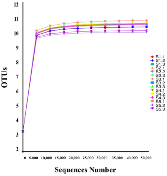 The dilution curve was generated by randomly subsampling sequences from the samples, considering both the number of obtained sequences and the number of operational taxonomic units (OTUs) that can be represented based on the sequencing depth [15,16]. As illustrated in Figure 2, the curve reaches a plateau as sequencing depth increases, indicating that OTU richness, Shannon diversity index, and Simpson evenness index attain saturation at the current sequencing depth. Consequently, this level of sequencing is adequate to capture most bacterial diversity present in the tested samples and can be utilized for subsequent data analysis.