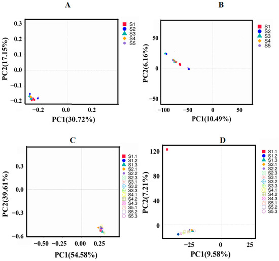 Principal component analysis (PCoA) reveals dissimilarities in community species composition among samples based on the similarity of distances. Different colors or shapes of points represent distinct samples, with closer distances indicating more similar species compositions between them. When PC1 accounted for 30.72% and PC2 accounted for 17.15% (Figure 3B), the bacterial communities from each sample of H. arenarium (L.) Moench exhibited significant aggregation, demonstrating extremely close distances to one another, which suggests a lack of apparent differences in microbial bacterial flora. Each data point in Figure 3C corresponds to a sample, and the distribution of these points indicates that the bacterial community composition within each rhizosphere sample is centralized; however, a few samples displayed substantial variations. When PC1 was at 54.58% (Figure 3D), certain distances were observed among rhizosphere soil fungal communities within each sample, indicating some degree of variability in species compositions across samples; when PC2 reached 39.61%, three rhizosphere fungal communities exhibited considerable differences compared to other fungal communities.