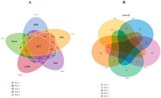 The rhizosphere soil bacteria comprised a total of 8261 operational taxonomic units (OTUs), with each soil sample displaying both shared and unique OTUs. Specifically, sample S1.1 exhibited 808 unique OTUs, accounting for 9.78% of the overall total; sample S2.1 contained 1044 unique OTUs, representing 12.64% of the total; sample S3.1 possessed 1288 unique OTUs, amounting to 15.59% of the toral; sample S4.1 included 948 specific OTUs, contributing to 11.48% of the total of the total; and finally, sample S5.1 harbored a distinct set of 901 OTUs, comprising approximately 10.91% of the total.