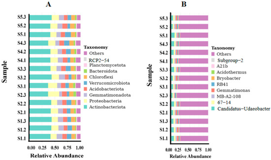 The high-throughput amplification sequencing results indicated that the soil bacteria in the rhizosphere of H. arenarium (L.) Moench were classified into 35 phyla, 93 classes, 215 orders, 324 families, 521 genera, and 231 species (Table 7). Several bacterial communities within the rhizosphere of H. arenarium (L.) Moench exhibited a relative abundance exceeding 1% at the phylum level: Actinobacteriota constituted 41.30%, Proteobacteria comprised 14.08%, Acidobacteriota represented 8.32%, Verrucomicrobiota accounted for 7.86%, Gemmatimonadota made up 9.21%, Bacteroidota contributed to 3.02%, Chloroflexi encompassed 7.47%, and Planctomycetota formed approximately 1.45% of the total. At the genus level, several bacterial communities also demonstrated a relative abundance greater than 1%. These included Candidatus Udaeobacter at a proportion of 6.11%, followed by strain 67-14 with an abundance of 4.48%. Gemmatimonas accounted for 3.26%, MB-A2-108 represented 3.26%, and RB41 contributed 2.67% (Figure 5). Notably, Actinobacteria predominated at the phylum level.