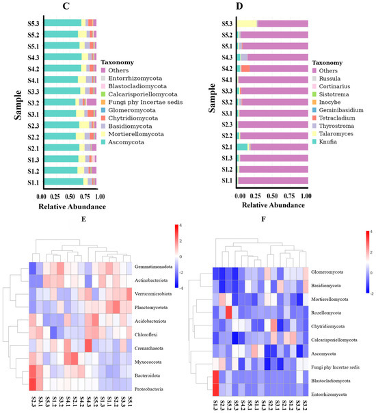 Histogram depicting relative abundance of species at both phylum and genus levels. Note: (A) refers to histogram of relative abundance of species at H. arenarium (L.) Moench bacterial phylum level, (B) refers to histogram of relative abundance of species at H. arenariu (L.) Moench bacterial genus level; (C) refers to histogram of relative abundance of species at H. arenarium (L.) Moench fungal phylum level, (D) refers to histogram of relative abundance of species at H. arenarium (L.) Moench fungal genus level; (E) refers to heat map analysis of clustering of fungal species abundance; (F) refers to species evolutionary tree at fungal genus level.