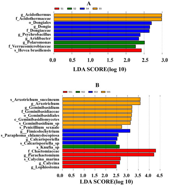 Histogram of LDA value distribution of rhizosphere soil of H. arenarium (L.) Moench. Note: (A) refers to bacteria; (B) refers to fungi.