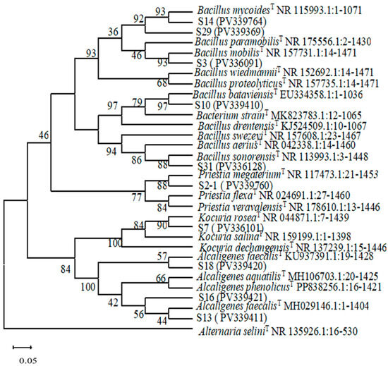 Genomic DNA was extracted from nine growth-promoting strains, and the 16S rRNA sequences were determined and compared using the NCBI database. The phylogenetic tree was constructed utilizing MEGA11 software. The sequencing results indicated that all nine growth-promoting strains exhibited a degree of similarity greater than 99%. These strains were classified into three genera: Bacillus within Firmicutes, Alcaligenes within Proteobacteria, and Kocuria within Actinomyces. Among these, five strains belonged to the genus Bacillus, three strains belonged to the genus Alcaligenes, and one strain belonged to the genus Kocuria. Within the genus Bacillus, strain S2-1 was tentatively identified as Priestia megaterium. We identified strain S3 as B. mobilis, strain S31 as B. sonorensis, and strain S10 as B. bataviensis. Strain S14 was identified as B. mycoides, while strain S29 was classified as B. paramobilis. Strains S18, S13, and S16 of the genus Alcaligenes were identified as A. faecalis. Lastly, strain S7 within the genus Kocuria was tentatively identified as Kocuria rosea (Figure 7).